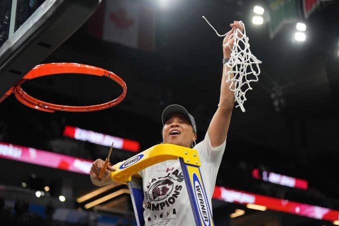Apr 3, 2022; Minneapolis, MN, USA; South Carolina Gamecocks head coach Dawn Staley cuts down the net as they celebrate their 64-49 victory over the UConn Huskies in the Final…