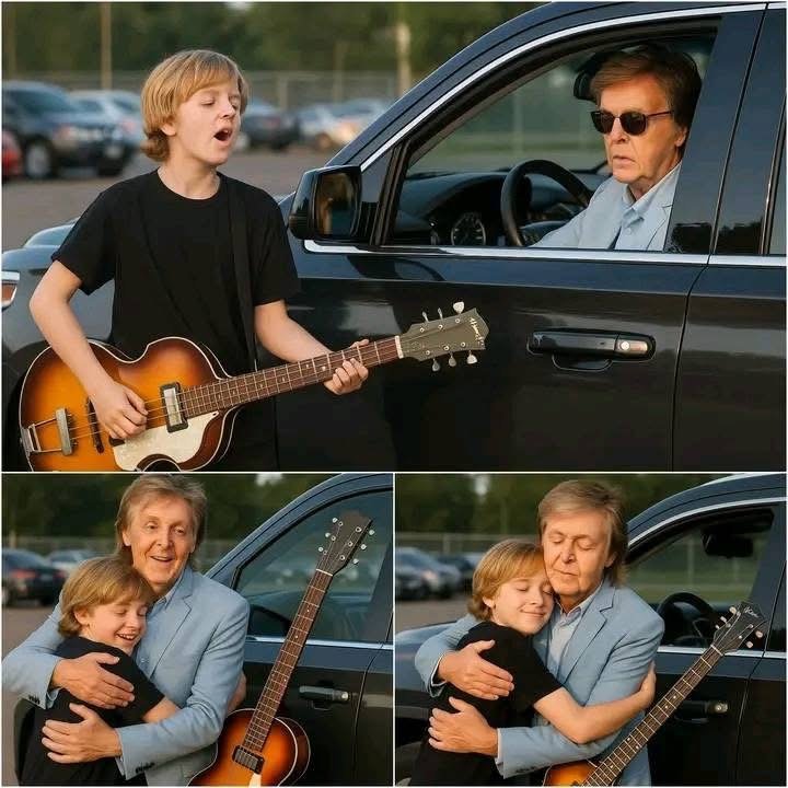 As McCartney’s SUV rolled slowly toward the venue gates, security staff, road crew, and a few lingering fans stood nearby, hoping for a final glimpse of the legendary musician. Amid the quiet shuffle of packing equipment and the hum of engines, a soft melody floated above the noise: the sound of a young boy, no older than twelve, strumming his acoustic guitar.