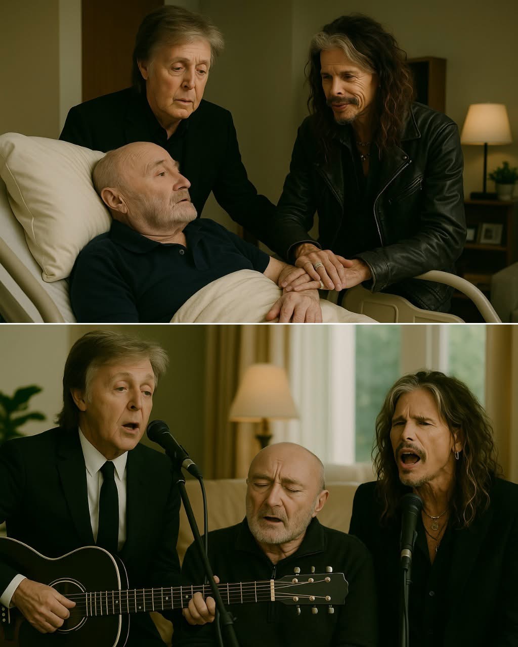 When they entered Phil’s room, there was a hush, followed by a fragile but unmistakable smile from the man himself. Thinner now, visibly weakened, but unmistakably Phil—the soul of Genesis, the voice behind some of the most beloved songs in pop history. He opened his arms, and the three legends embraced, something unsaid passing between them in that moment. Time, fame, ego—all of it faded away. What remained was friendship. Brotherhood.