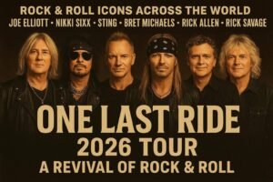 The world of rock music was set ablaze today as six legendary names — Joe Elliott, Nikki Sixx, Sting, Bret Michaels, Rick Allen, and Rick Savage — stood side by side to announce what is already being hailed as the most ambitious and emotional rock tour of the decade. Titled “ONE LAST RIDE,” the global tour scheduled for 2026 will unite these icons for a series of shows that promise to both honor the past and inspire the future of Rock & Roll.