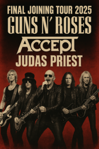 In what is already being hailed as one of the most historic announcements in the world of rock and heavy metal, three iconic bands—Guns N’ Roses, Accept, and Judas Priest—have revealed plans to join forces for a massive, once-in-a-lifetime final 2025 tour. The announcement, made in Los Angeles yesterday, has sent shockwaves through the global rock community, uniting generations of fans eager to witness the legends share one stage for the very last time.