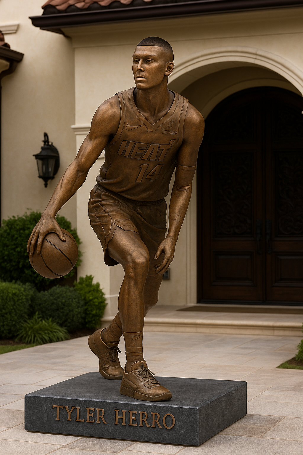 The statue, crafted in bronze, captures Herro mid-dribble — a pose symbolizing his signature playing style: smooth, confident, and fearless. Set against the backdrop of his home, the monument stands as a tribute to a player whose journey from a young prospect in Wisconsin to an NBA star has been nothing short of inspirational.