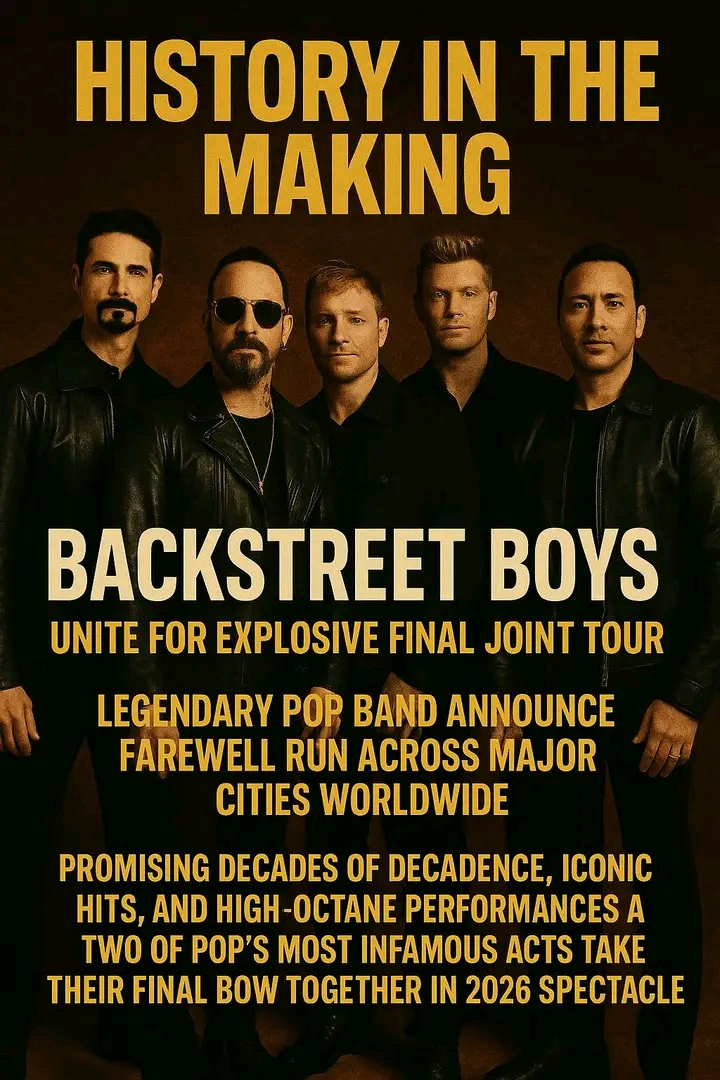 In a bombshell announcement that’s already sending shockwaves through the music world, the **Backstreet Boys** have confirmed they will embark on a final joint world tour in **2026**, marking the dramatic end of an era for one of pop’s most beloved boy bands. The tour, described as their “farewell run,” promises to traverse major global cities with a promise of decadence, nostalgia, and a full-throttle celebration of their quarter-century reign in pop music.