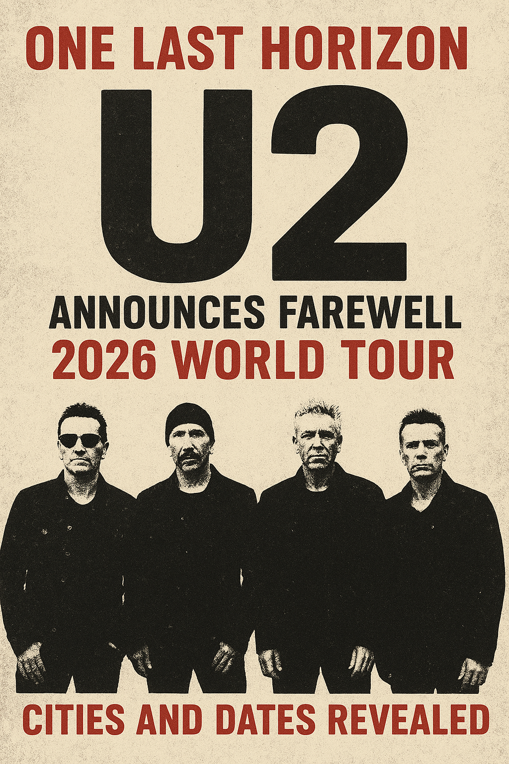 In a stunning and emotional announcement that has sent shockwaves through the music world, U2 — one of the most iconic and influential rock bands of all time — has officially revealed plans for their Farewell 2026 World Tour, titled “One Last Horizon.” After more than four decades of redefining stadium rock, the legendary quartet — Bono, The Edge, Adam Clayton, and Larry Mullen Jr. — will embark on their final global journey, marking the end of an era that has inspired millions across generations.