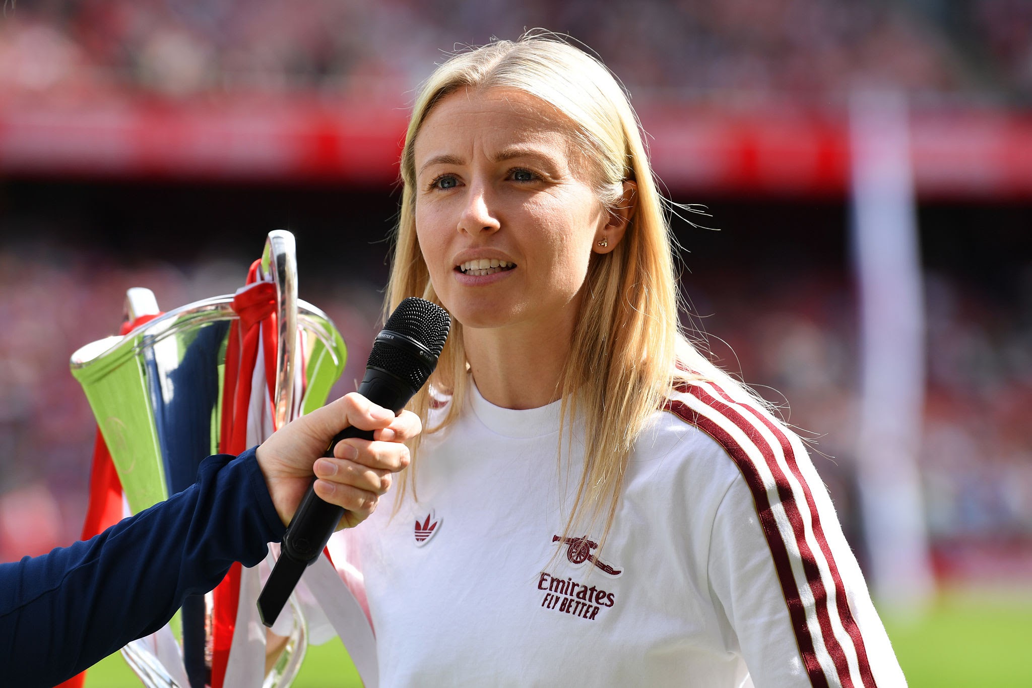 LONDON, ENGLAND - SEPTEMBER 06: Leah Williamson of Arsenal talks during a pitchside interview prior to the Barclays Women's Super League match between Arsenal and London City Lionesses at Emirates Stadium on September 06, 2025 in London, England. (Photo by Alex Burstow/Arsenal FC via Getty Images)