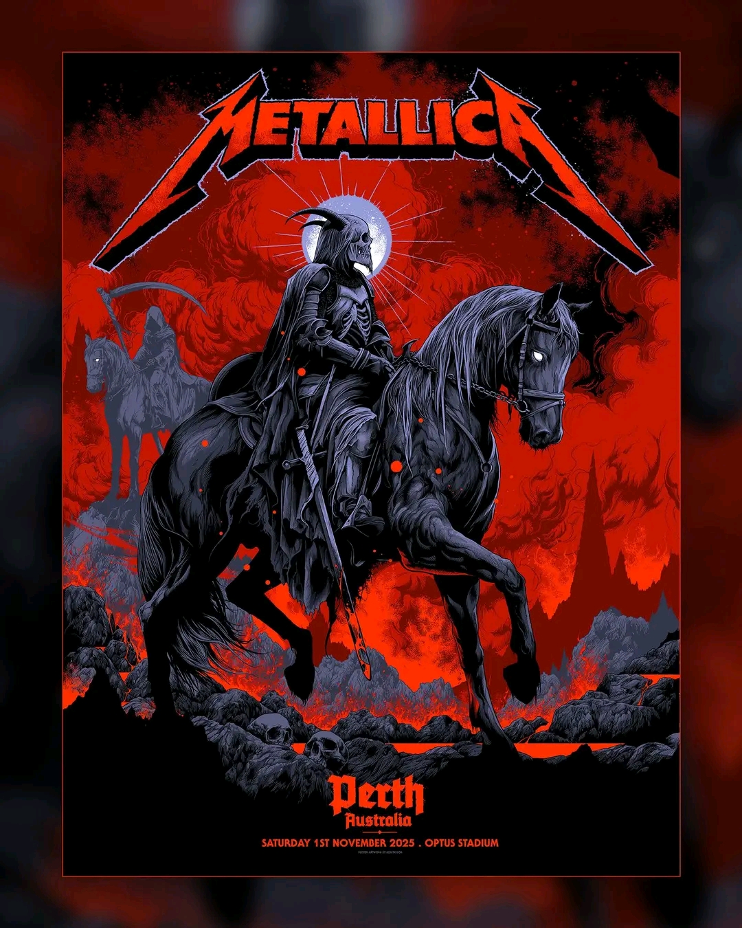 Metallica fans in Perth are in for an electrifying weekend as the band unveils a brand-new **exclusive pop-up shop poster** created by acclaimed illustrator **Ken Taylor**. Known for his bold use of color, intricate detail, and unmistakable design style, Taylor has crafted a limited-edition piece that marks the **first installment in a larger interconnected poster series** tied to the band’s ongoing **M72 World Tour**.