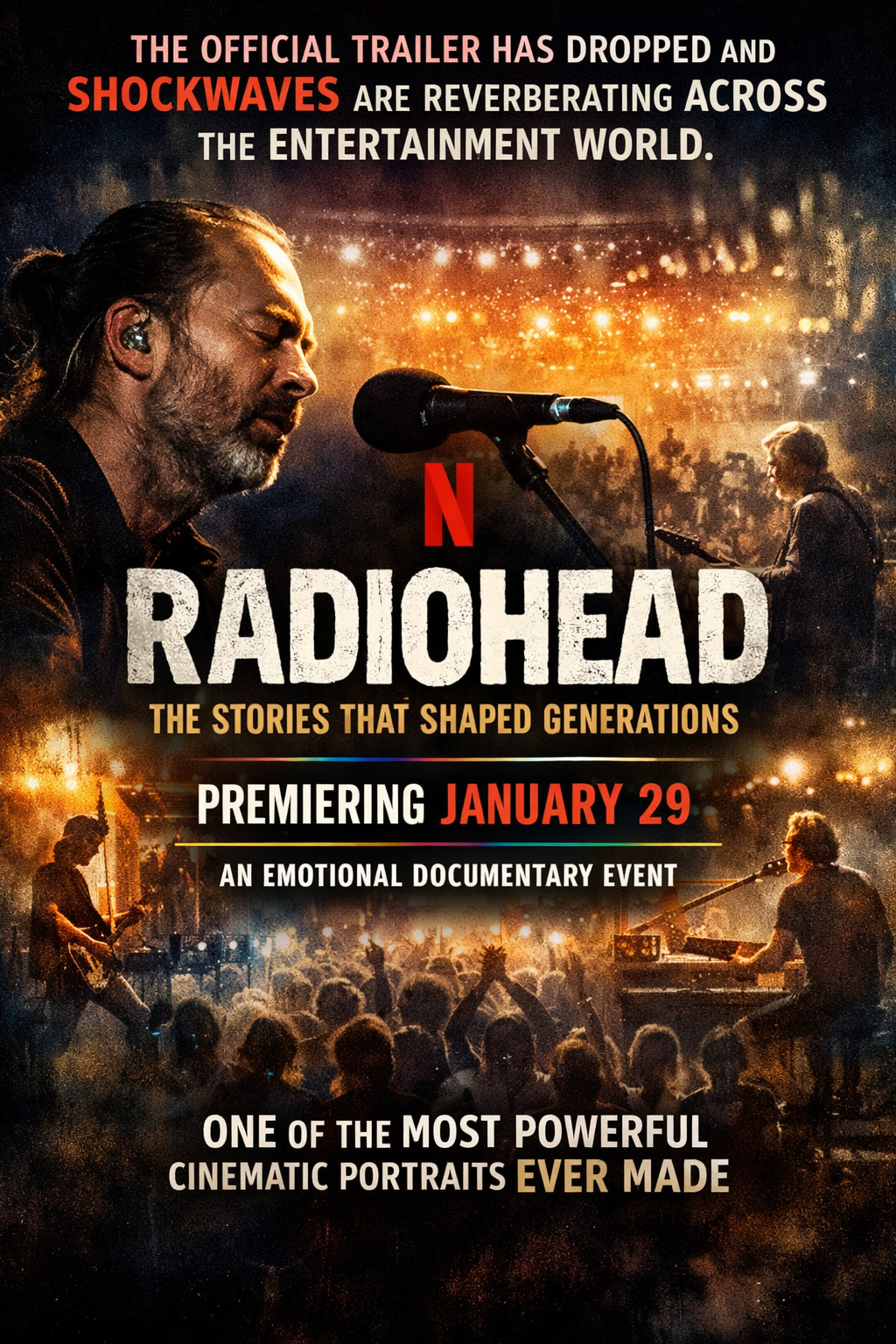 Netflix has officially unveiled the trailer for “RADIOHEAD: The Stories That Shaped Generations,” and almost instantly, the internet seemed to hold its breath. Within minutes of the trailer’s release, social feeds flooded with stunned reactions, music forums lit up with emotional retrospectives, and longtime fans began counting the days. Set to premiere on January 29, the documentary is already being hailed as a landmark cultural moment—one that goes far beyond a standard music biography.